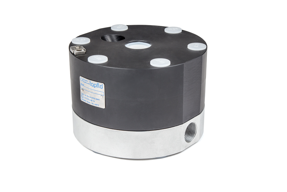 Los amortiguadores están disponibles con el certificado ATEX, por lo tanto, son adecuados para operar en entornos con riesgo potencial de explosión. Se entregan con una toma a tierra y se construyen con materiales conductores: cuerpo de la máquina conductor, membranas de PTFE (conductor) o de EPDM (conductor)